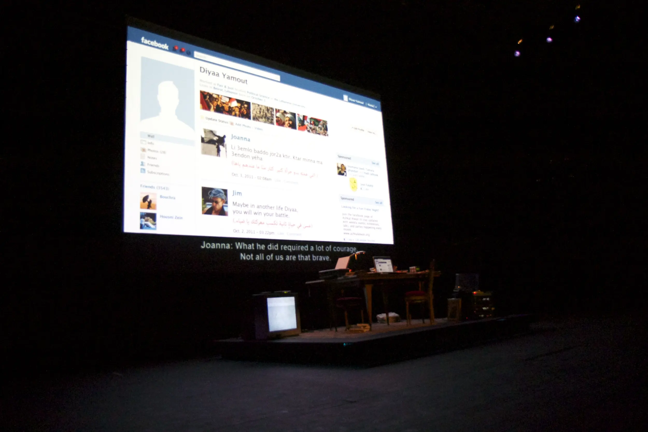 À partir des articles de son quotidien – téléphone, répondeur, poste de télévision, ordinateur – qui continuent à vivre et à fonctionner, Lina Majdalanie et Rabih Mroué inventent un étonnant théâtre d’objets documentaires. Sur la scène, ces outils autonomes se font témoins du geste terrible du jeune activiste, mais ils révèlent aussi les impasses de la société libanaise : réactions sur les réseaux, affrontements, tentatives de récupération. Un décor fantomatique qui dresse le portrait lucide d’un monde à la dérive.