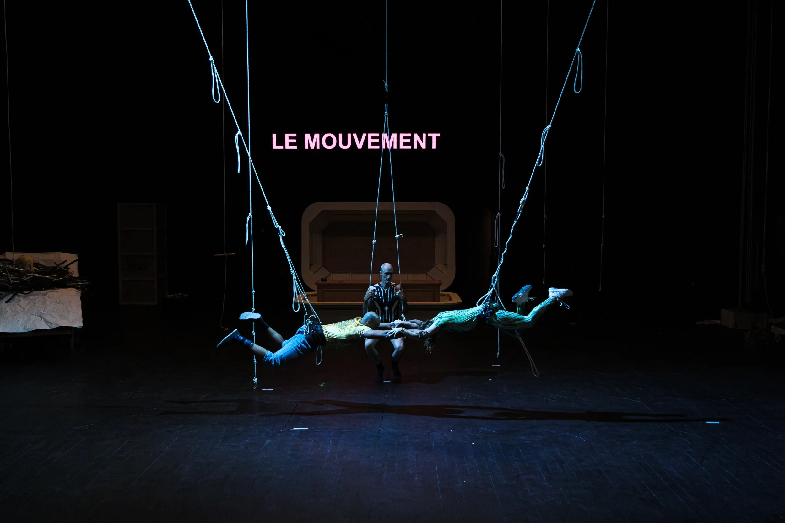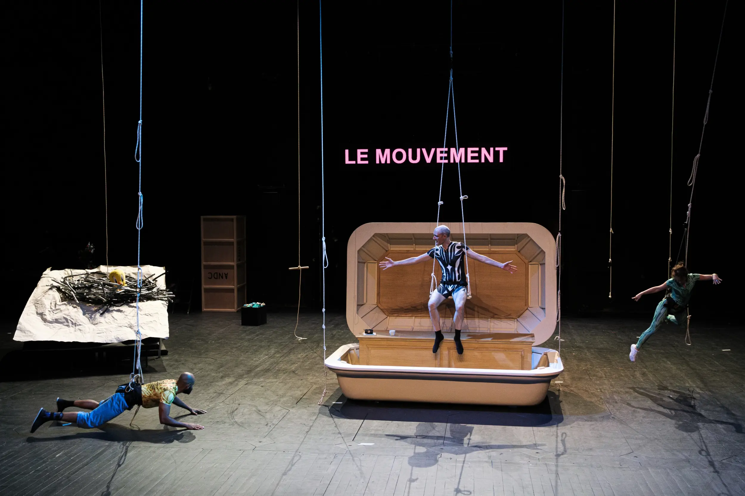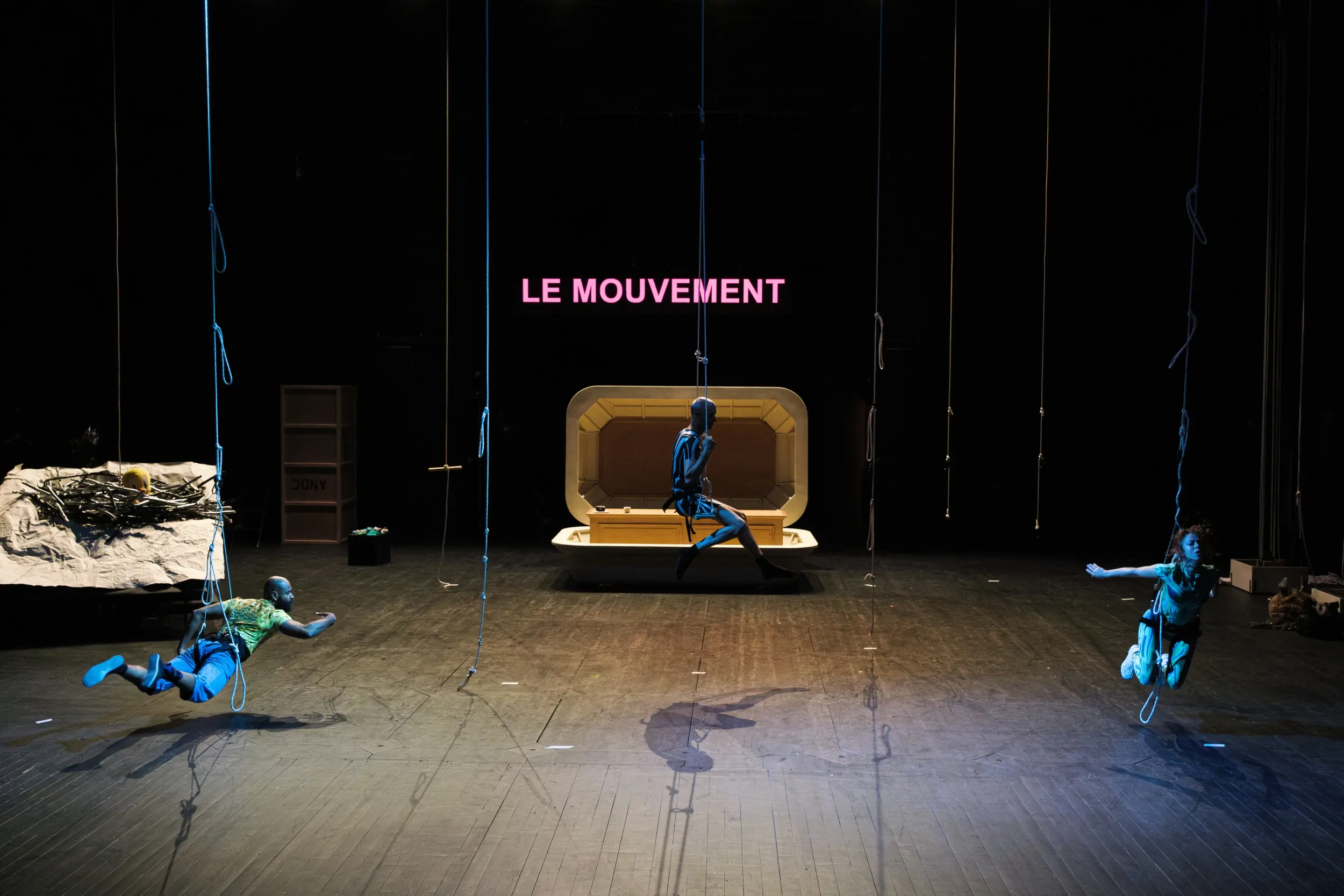 Après Ahouvi en 2023, l’artiste d’origine israélienne Yuval Rozman aborde le quatrième opus de ce qu’il nomme la Quadrilogie de ma Terre, une œuvre passionnante qui aborde le lien avec son pays natal et le territoire israélo-palestinien. Dans cet ultime épisode, il prend du recul ou, plus exactement, de la hauteur, mettant en jeu le point de vue de trois oiseaux qui, depuis la canopée, s’interrogent… Dans le ciel de la Cisjordanie, les volatiles enquêtent sur l’assassinat d’un jeune Palestinien autiste de 32 ans, tué par la police israélienne en 2020. De cet événement tragique, Yuval Rozman compose une comédie noire où la parole des oiseaux tente d’explorer le drame en montant un procès, sur la terre et dans les airs, pour comprendre, avec esprit et humour, la folie des hommes.